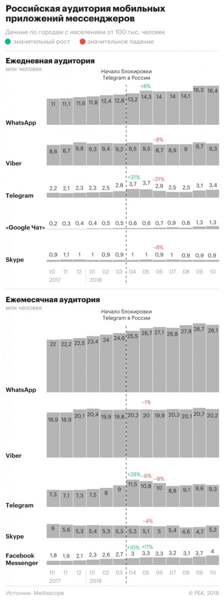 В октябре 2018 года ежедневная российская аудитория мобильного приложения Telegram составила почти 3,4 млн человек в возрасте 12-64 лет, проживающих в городах с населением от 100 тыс. человек (100+). Такие данные предоставила РБК исследовательская компания Mediascope. Ежемесячная российская аудитория мобильного приложения Telegram в октябре 2018 года приблизилась к 9,3 млн человек.