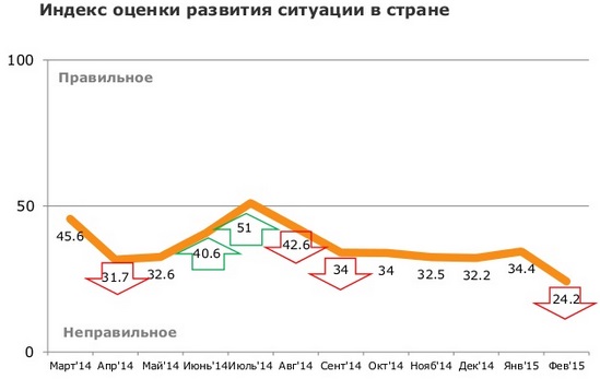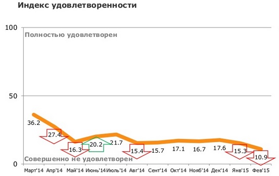 Уровень удовлетворенности событиями в стране, по результатам онлайн-исследования, значительно снизился на протяжении последних двух месяцев. В феврале индекс удовлетворенности достиг наименьшего значения за последний год.