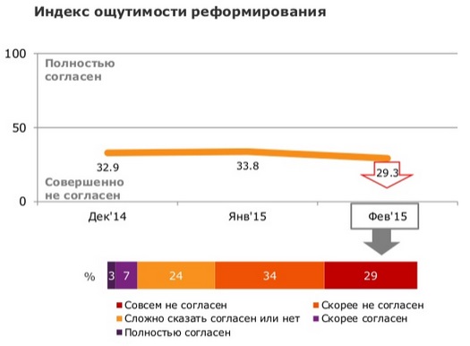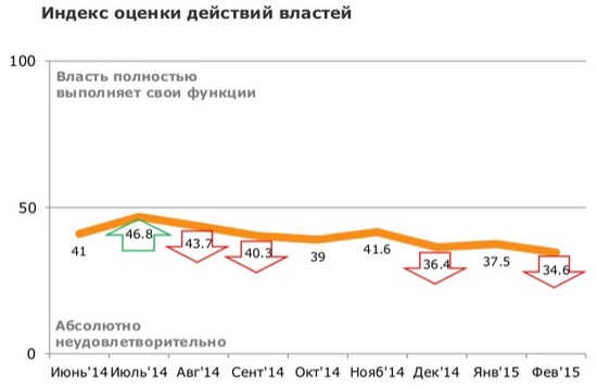 С августа 2014 года, как показывают данные опроса, у украинцев наблюдается постепенное снижение удовлетворенности действиями властей по стабилизации ситуации в стране. 34% респондентов оцениваю деятельность властей как абсолютно неудовлетворительную, 26% считают, что власть преимущественно не выполняет свои обязанности, 35% верит, что власть что-то делает, но не в полном объеме и несвоевременно, и только 1,7% убеждены, что власть успешно выполняет свои функции.