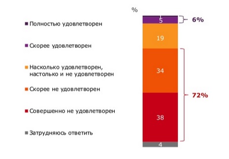 Деятельностью Верховной Рады недовольны 75% респондентов. При этом в Восточной Украине тех, кто совершенно неудовлетворен нынешней Верховной Радой, — 46%, в Киеве и вообще на севере страны — 23% таких респондентов, в Центральной Украине — 27%.