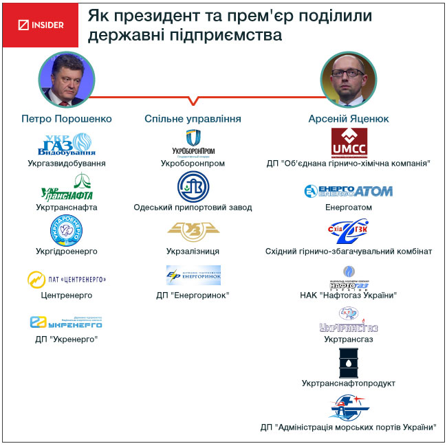 Ожесточенная борьба между руководством Украины происходит не за звание того, кто лучше реформирует страну, а за потоки, генерируемые большими государственными предприятиями. Для контроля над ними Порошенко и Яценюк, начиная с самого прихода к власти, назначали свои кадры в государственные компании.