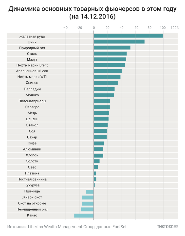 Впервые за шесть лет индекс Bloomberg Commodity Index может вырасти по итогам года. В 2015-м его снижение стало худшим за последние семь лет — индекс потерял почти четверть своей стоимости. В этом году его рост составляет 11,5%. «Мы думаем, ралли продлится еще несколько лет. Поддерживать его будут сочетание спроса и предложения, решения правительства и интерес со стороны инвесторов, рассматривающих сырье как защиту от инфляции», - добавляет Вайк.