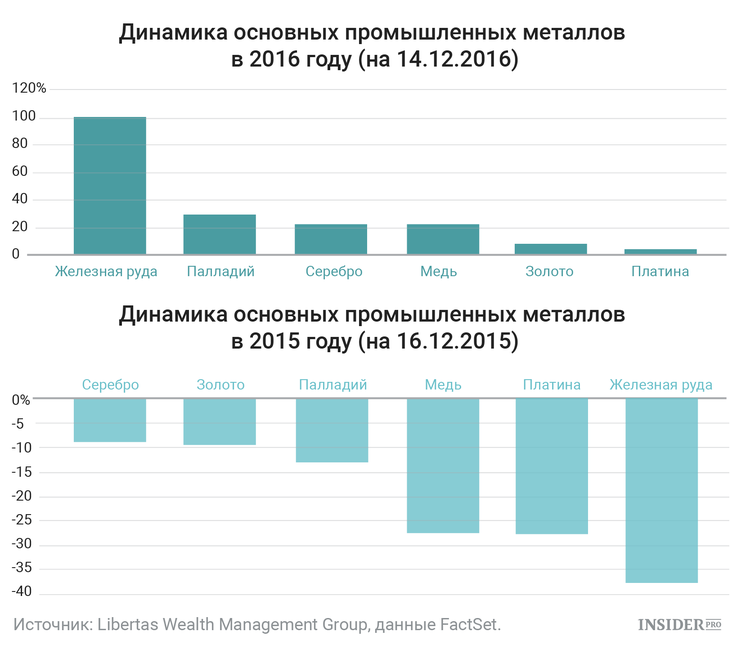 За 11 месяцев текущего года цены на железную руду почти удвоились, потеряв 46% в 2015-м. Медь подорожала примерно на 22%, подешевев на 24% в прошлом году. Палладий прибавил 29% в этом году и снизился примерно на ту же величину в за аналогичный период 2015-го.
