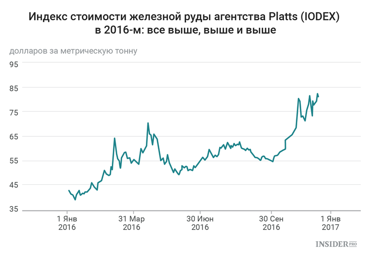 С начала года индекс стоимости металла S&P Global Platts IODEX прибавил 92,7%. По словам Иннеса, железная руда реагирует на спрос со стороны китайских сталелитейных предприятий. В этом году производство стали в КНР составит 810 млн тонн, в то время как в большинстве прогнозов оно не превышало 800 млн тонн.