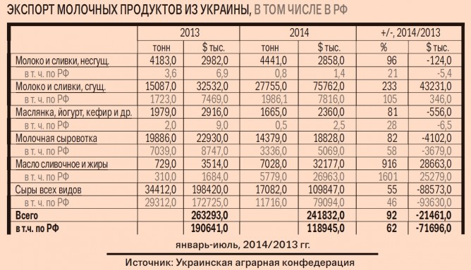 The decrease in export led to the reduction of the production volumes of cheese. The State Statistics Service reported that in January-August 2014 Ukraine produced 85,200 t of cheese, which is 23% less than in the same period last year. “This is not surprising as cheese exports have become miserly, while domestic consumption is not increasing,” explains Director of the InfAgro Analytical Agency Vasyl Vyntonyak. Unlike in the previous year, producers are not risking to produce cheese products and stockpile them in warehouses, he adds. “As the minimum stocks are being sold, the plants are resuming operation and then their operation is suspended again in a manual regime,” he explains.