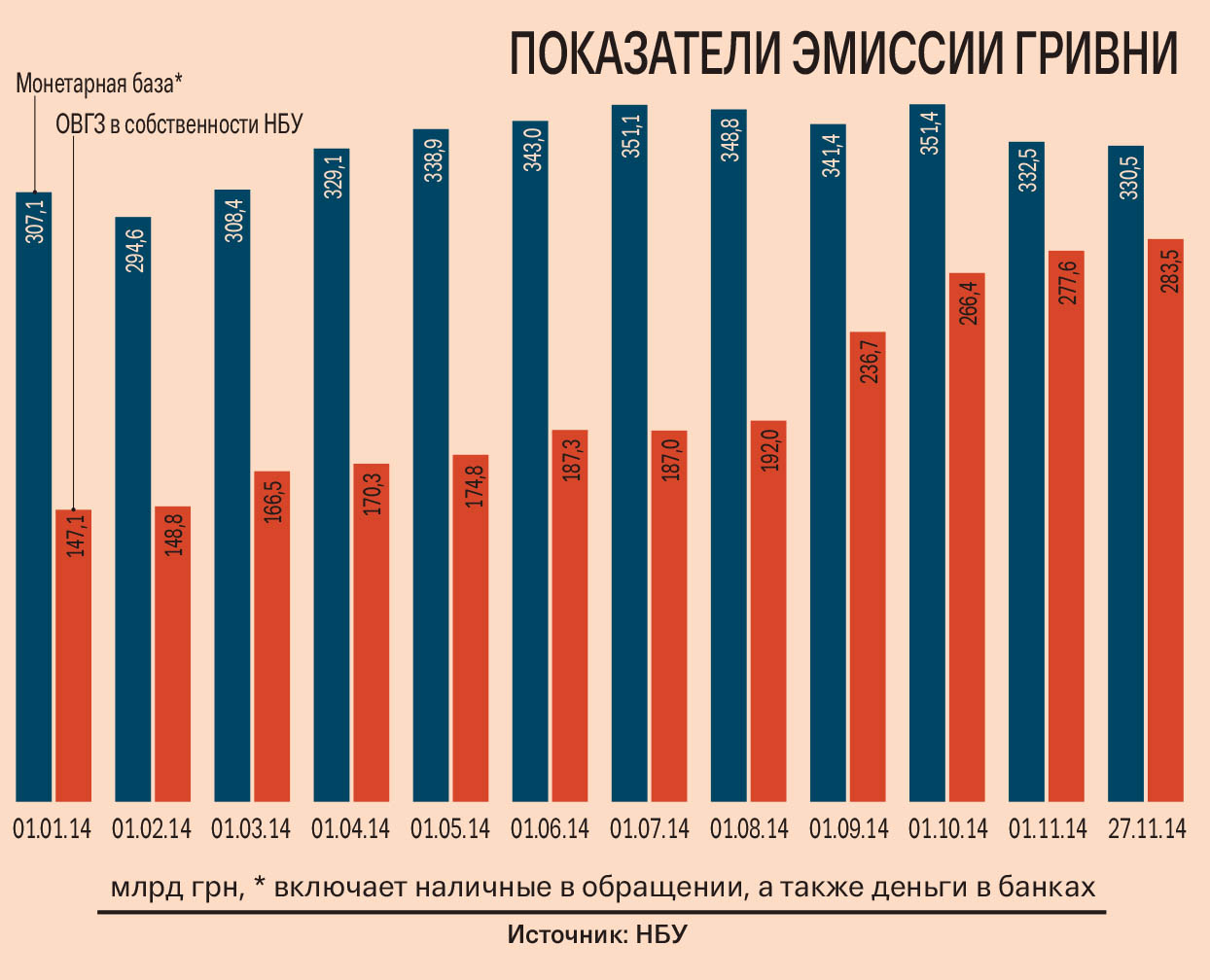 Relying on the statistics of the monetary base, the NBU is not talking about the volumes of redemption of government bonds. Since the start of the year, the volume of government bonds in the portfolio of the NBU grew by UAH 139.9 bn. This is higher than in 2013, when the central bank accumulated UAH 41.4 bn in bonds (in 2012, this figure was only UAH 21.2 bn). The volumes of bonds purchased in 2014 are nothing but hidden emissions, say experts. “On the one hand, banks spend real hryvnia to buy bonds. On the other hand, they get refinancing from them, which means emissions. Moreover, the Ministry of Finance uses the funds from the sale of bonds to cover expenditures of the budget,” Krapivin explains.