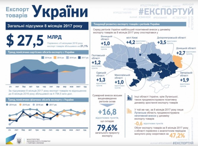 Экспорт товаров из Украины за восемь месяцев 2017 года составил $27,5 млрд, из них $11 млрд приходится на экспорт товаров в ЕС. Об этом на своей странице в Facebook сообщила торговый представитель Украины Наталья Микольская.