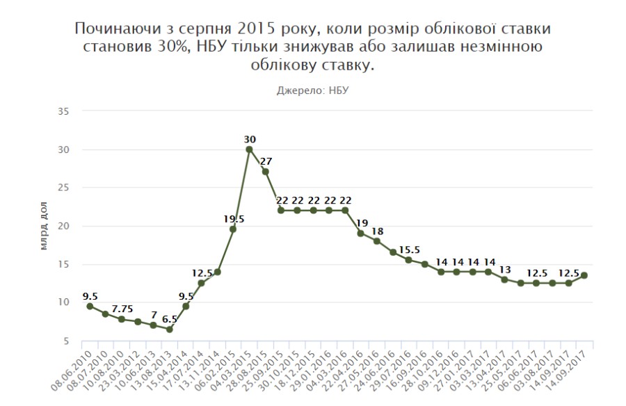 Отметим, что начиная с августа 2015 года, когда размер учетной ставки составлял 30%, НБУ только снижал или оставлял неизменной учетную ставку.