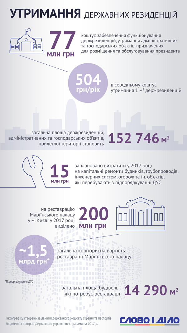 Содержание и ремонт государственных резиденций, общая площадь которых составляет 15,3 га, обойдется в 77 млн грн. Содержание одного квадратного метра резиденции стоит 504 грн в год.