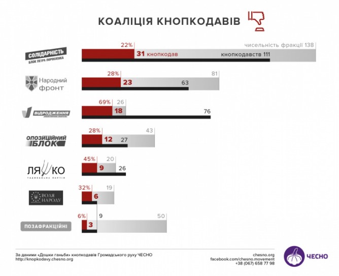 Так, наибольшее количество «кнопкодавов» во фракции партии БПП «Солидарность» — 31 депутат. За три года они прибегли к таким нарушениям 111 раз. На втором месте в рейтинге политическая партия «Народный фронт» — 23 ее депутатов были замечены у пультов для голосования других депутатов 63 раза.