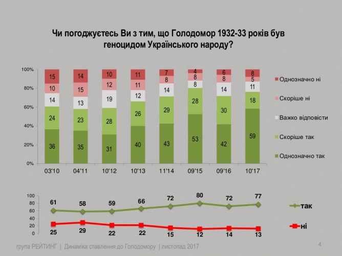 Не согласились с этим утверждением 13% респондентов, не определились — 11%. Социологи отмечают, что число тех, кто признает Голодомор геноцидом, увеличилось по сравнению с прошлым годом (72%), в то время оно несколько меньше по сравнению с 2015 годом (80%).