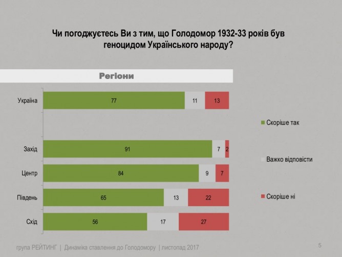 Утверждение, что Голодомор 1932-1933 годов был геноцидом украинского народа, разделяет подавляющее большинство жителей запада страны (91%), большинство опрошенных в центре (84%), две трети на юге (65%) и больше половины — на востоке (56%).