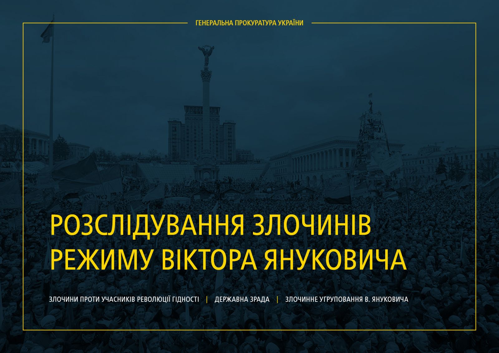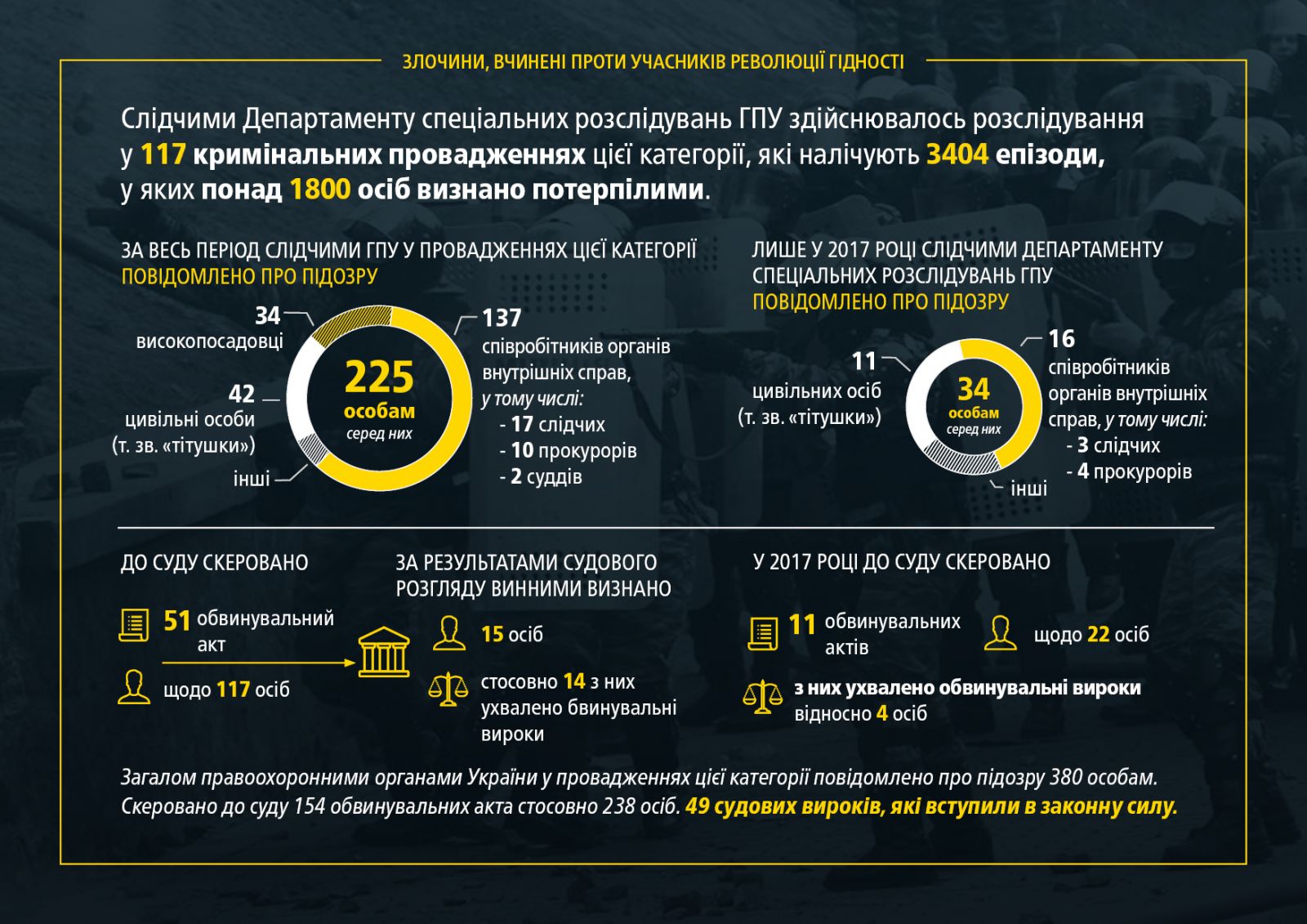 Так, следователями Департамента специальных расследований ГПУ осуществлялось расследование по 117 уголовным производствам по поводу преступлений, совершенных против участников Революции достоинства, насчитывающих 3404 эпизода, в которых более 1800 человек признаны потерпевшими.