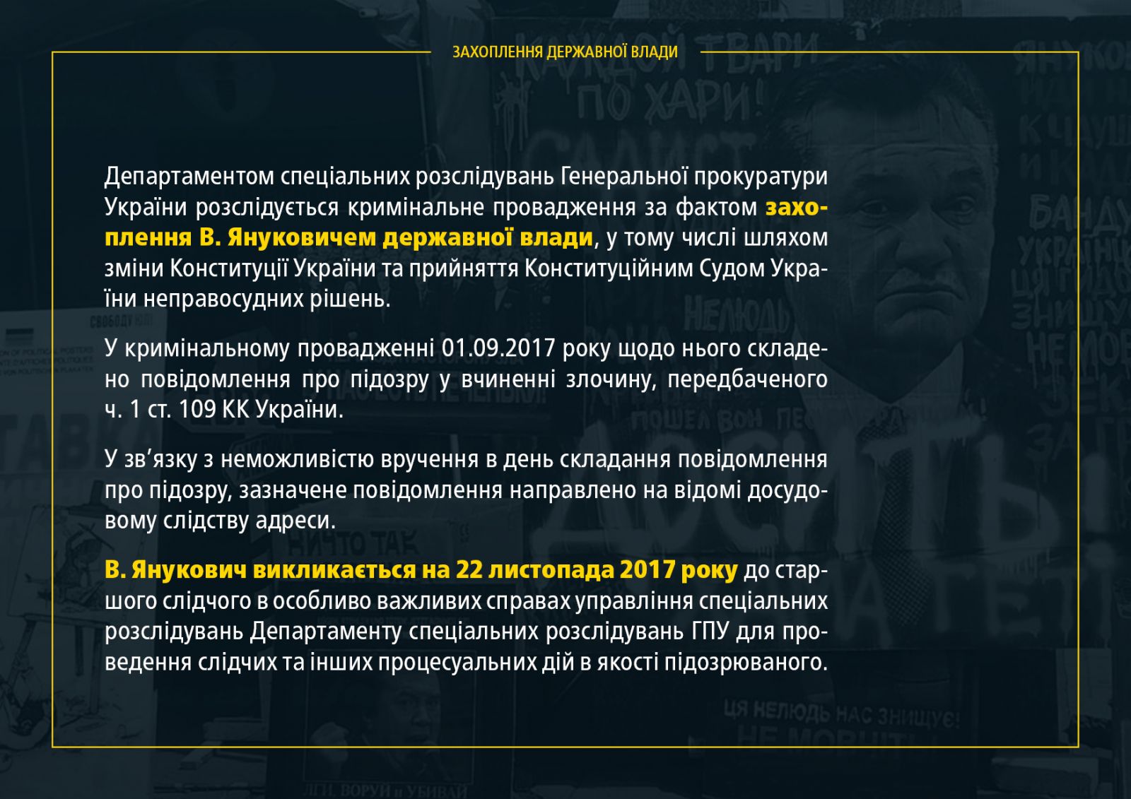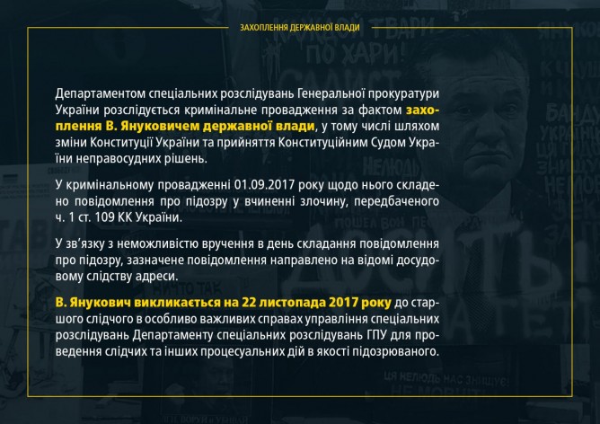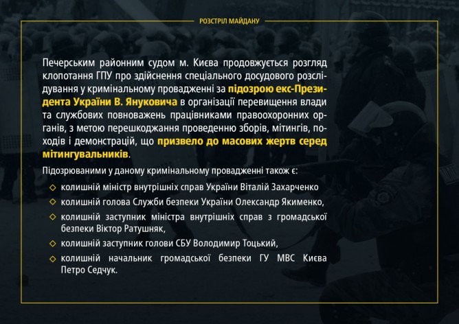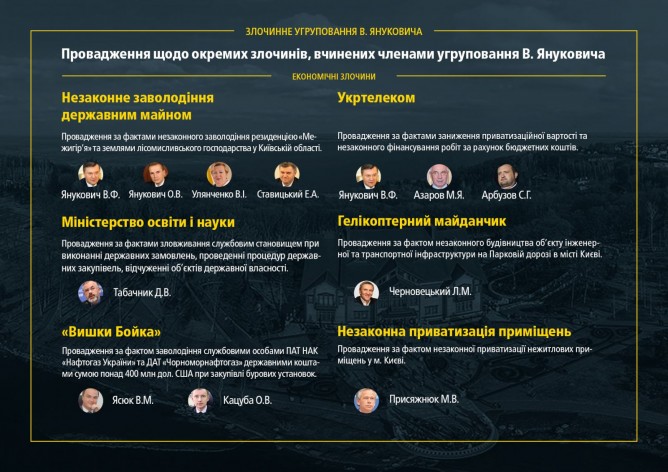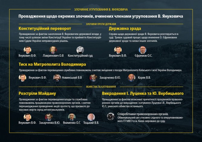 Кроме того, открыты производства по отдельным преступлениям, совершенным членами группировки Януковича, в том числе преступления против государства (конституционный переворот, государственная измена, давление на митрополита Владимира), убийства и пытки (расстрелы Майдана, похищения И. Луценко и Ю. Вербицкого), а также экономические преступления.
