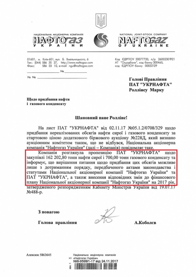 «Компания рассмотрела предложение „Укрнафты“ о закупке 162 тыс т нефти и 700 т газового конденсата. Информируем, что рассмотрение этого вопроса возможно только при внесении соответствующих изменений в финансовый план „Нафтогаза“ на 2017 г.», — говорится в документе.