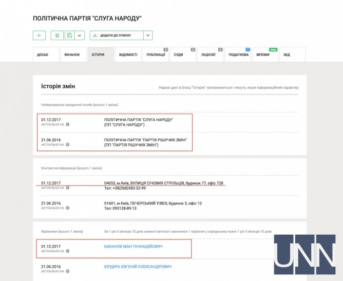 В то же время, согласно системе YouControl, ранее «Политическая Партия „Слуга народа“» называлась «Политическая Партия „Партия Решительных перемен“».