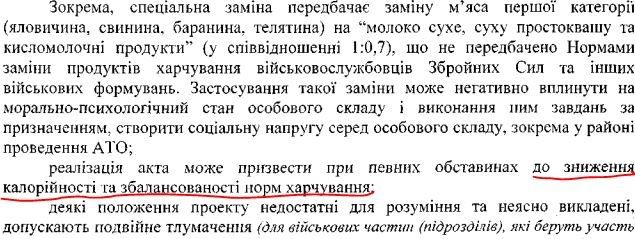 По мнению экспертов, такая замена может подорвать моральный дух в армии и создать социальное напряжение среди личного состава, особенно в зоне проведения АТО, и повлиять на калорийность питания.