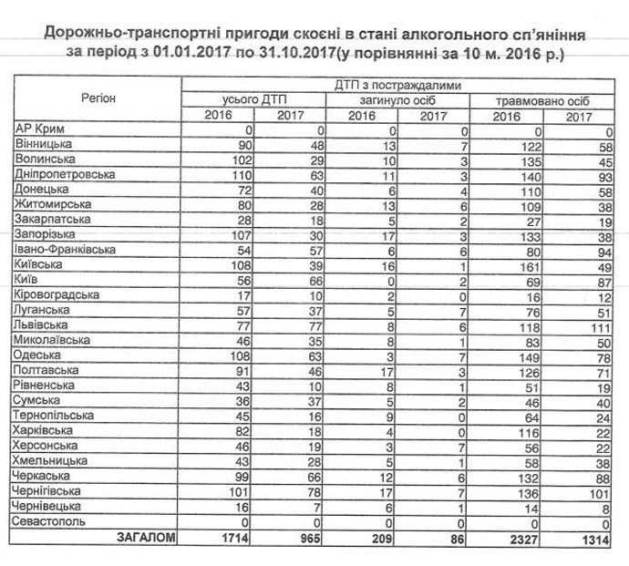 В Украине за 10 месяцев текущего года произошло 965 дорожно-транспортных происшествий при участии водителей в состоянии алкогольного опьянения, в которых погибли 86 человек. Об этом говорится в ответе Нацполиции на запрос депутата Киевсовета Александра Пабата.
