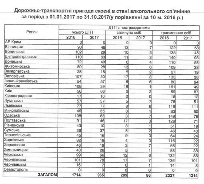 Больше всего «пьяных аварий» зафиксировано в Волынской, Днепропетровской, Ивано-Франковской, Львовской, Одесской, Черкасской, Черниговской областях и Киеве.