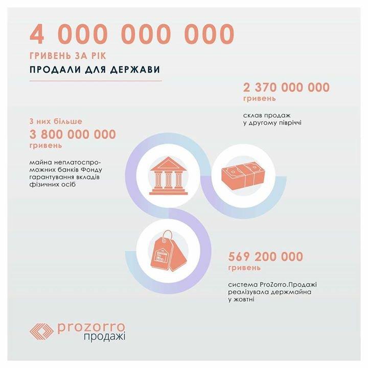 За 2017 год через систему было куплено товаров на сумму почти 4,7 млрд гривен. Среди них значительную долю составляли продажи имущества неплатежеспособных банков, а именно «Банк Форум», «Дельта банк», «Финансы и кредит», «Фидобанк» и «Банк Крещатик».