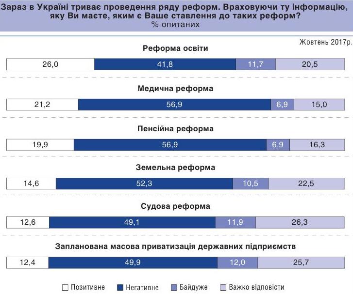 Лучше всего граждане Украины относятся к реформе образования: 26% поддерживали, 41,8% были против, 11,7% относились безразлично, 20,5% затруднились ответить.