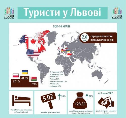 В основном во Львов приезжают украинцы, поляки и белорусы. Также во Львов путешествуют из Турции, Германии, США, Литвы, Великобритании, Чехии и Канады.