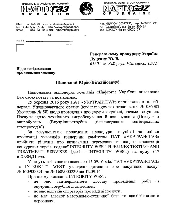 «„Укртрансгазом“ проведено служебное расследование о наличии/отсутствии в действиях должностных лиц компании признаков нарушения предписаний внутренних нормативных актов по результатам закупки услуг по внутритрубному диагностированию магистральных газопроводов», — сказано в письме.