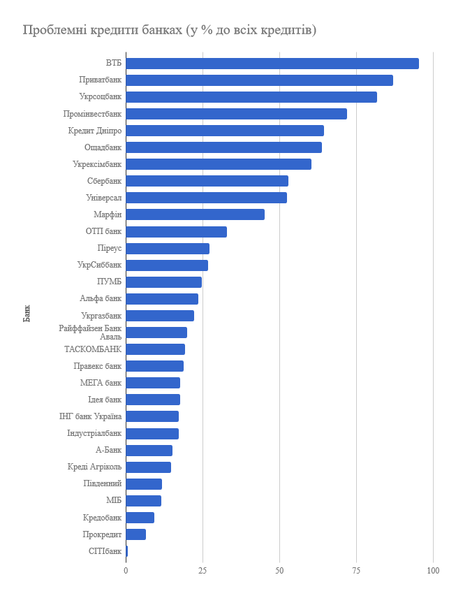 Возглавляют рейтинг банков с наибольшим процентом неработающих кредитов «дочка» российского Внешторгбанка (95,3%), государственный Приватбанк (86,9%) и Укрсоцбанк (81,84%).