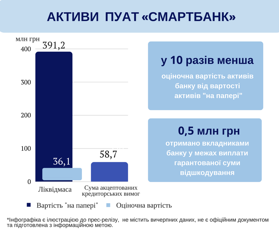 Уполномоченный представитель ФГВФЛ провел анализ операций «Смартбанка» в рамках его ликвидации. Выяснилось, что вследствие незаконных схем группа заемщиков незаконно получила деньги банка на сумму 391,3 млн грн.