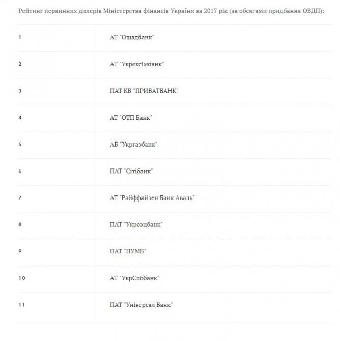 Об этом свидетельствуют данные рэнкинга банков — первичных дилеров рынка ОВГЗ, опубликованные Министерством финансов.