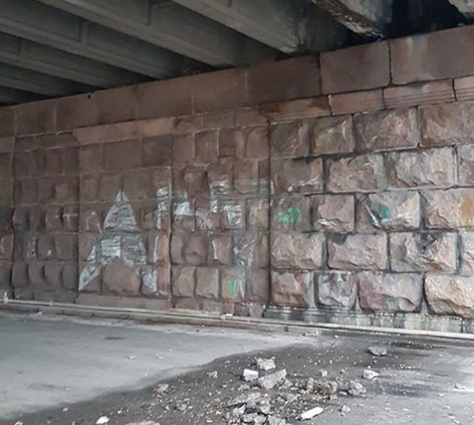 Разрушение путепровода произошло на нечетной стороне проспекта. По представленным фото видно, что большие куски бетона отламываются от конструкций моста и падают на тротуар.