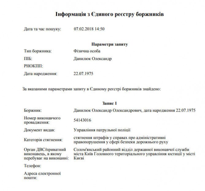 Сообщается также, что взыскать оплату долга с Данилюка должен Соломенский райотдел государственной исполнительной службы Киева.