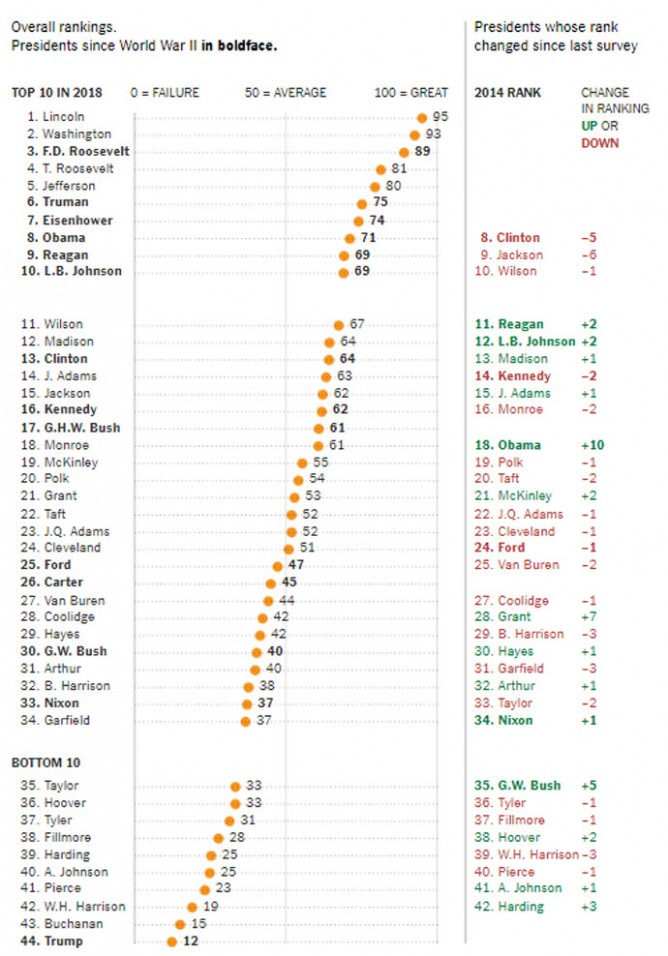 Трамп получил 12 баллов из 100 возможных и потеснил с последнего места Джеймса Бьюкенена — президента США в 1857 — 1861 годах, когда Соединенные Штаты втянулись в гражданскую войну.