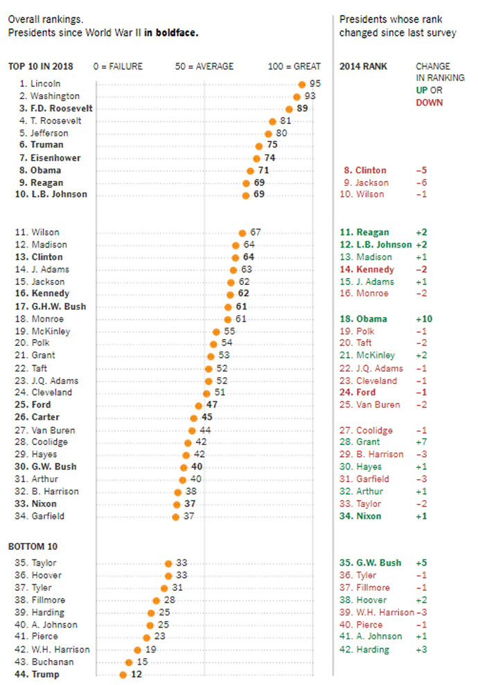 Первое место в рейтинге с 95 баллами занял Авраам Линкольн, второе — Джордж Вашингтон, третье — Франклин Рузвельт. Также в пятерке лидеров Теодор Рузвельт и Томас Джефферсон.