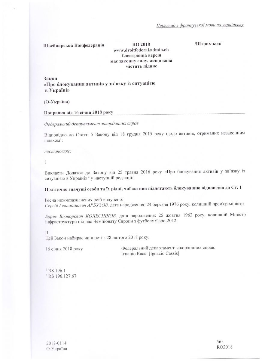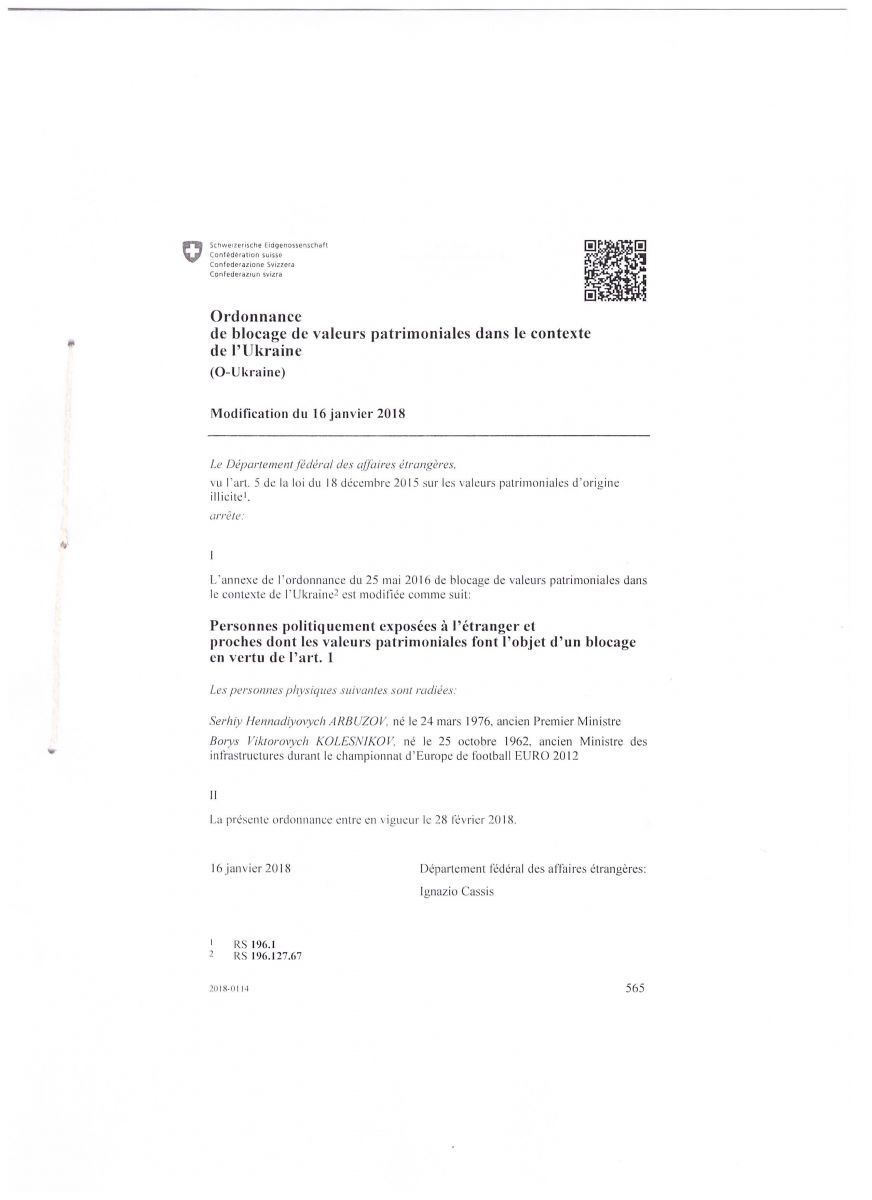 Швейцарская Конфедерации 16 января 2018 года прекратила действие мер ограничительного характера против экс-главы НБУ, бывшего первого вице-премьера Сергея Арбузова. Об этом идет речь в документе, копию которого предоставили адвокаты политика.