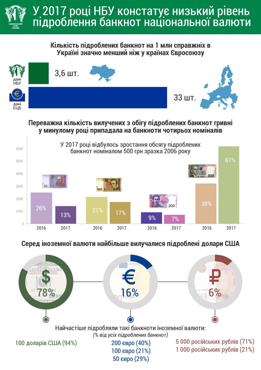 По данным НБУ, львиное число изымаемых из обращения фальшивых гривневых банкнот по-прежнему составляют купюры номиналом 500 грн, преимущественно образца 2006 года. В 2017 году их доля в общем количестве фальшивых банкнот возросла до 61% с 38% в 2016 году.