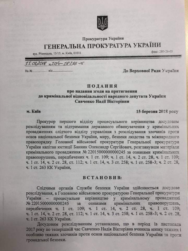 «(Планировалось — ред.) осуществить вооруженные нападения на квартиры Петра Порошенко, Арсена Авакова и Александра Турчинова с целью позавлення их жизни. Этими своими противоправными действиями Савченко совершила посягательство на жизнь президента Украины, народных депутатов, премьер-министра, членов Кабмина по предварительному сговору с группой лиц, то есть совершила уголовное правонарушение, предусмотренное частью 1 статьи 14, частью 28 статьи 112 Уголовного кодекса Украины», — говорится в документе.