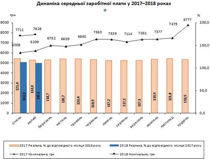 «Средняя номинальная зарплата штатного работника предприятий, учреждений и организаций в феврале 2018 года составляла 7,828 тысяч гривен, что в 2,1 раза выше уровня „минималки“ (3,723 тысяч гривен — ЭП)», — говорится в сообщении.