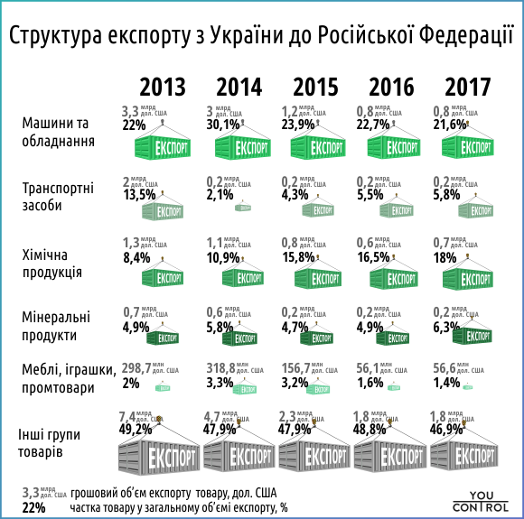 Экспорт товаров из Украины в Россию в 2017 году по сравнению с 2016-м вырос на 10% (с 3,5 до 3,9 млрд долларов). В прошлом году Украина больше продавала северному соседу минеральной и химической продукции, машин и оборудования. Также из Украины отправилось на 163% больше жиров растительного и животного происхождения.