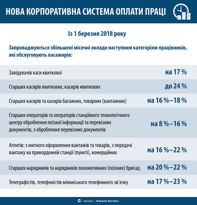 Так, с 1 марта 2018 года вводятся увеличенные месячные оклады таким категориям работников: заведующий билетной кассы — на 17%; старший кассир, кассир билетной кассы — до 24%; старший кассир и кассир багажный, товарный (грузовой) — на 16-18%; старший оператор и оператор станционного технологического центра обработки поездной информации и перевозочных документов, по обработке перевозочных документов — на 8-16%.