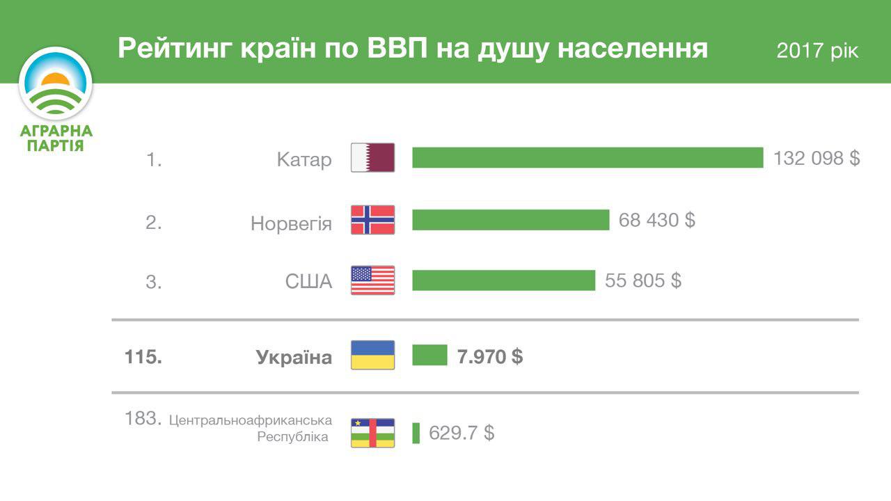 Политик показал результаты различных исследований, которые содержат данные об уровне развития Украины на фоне других стран. По уровню ВВП на душу населения наша страна заняла 115 место.