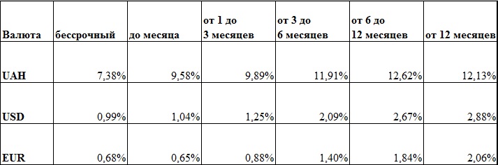 Согласно данным мониторинга, средняя процентная ставка в гривне выросла только для вкладов сроком свыше 12 месяцев (на 0,01 п.п. до 12,13%). Стоимость бессрочных сбережений по-прежнему составляет 7,38% годовых. Не претерпела изменений доходность вкладов периодом до 1 месяца (9,58%). Вклады сроком от 1 до 3 месяцев предлагают 9,89% годовых, а депозиты на период от 3 до 6 месяцев - 11,91% годовых. Средняя ставка сбережений на срок от 6 до 12 месяцев составляет 12,62% годовых.
