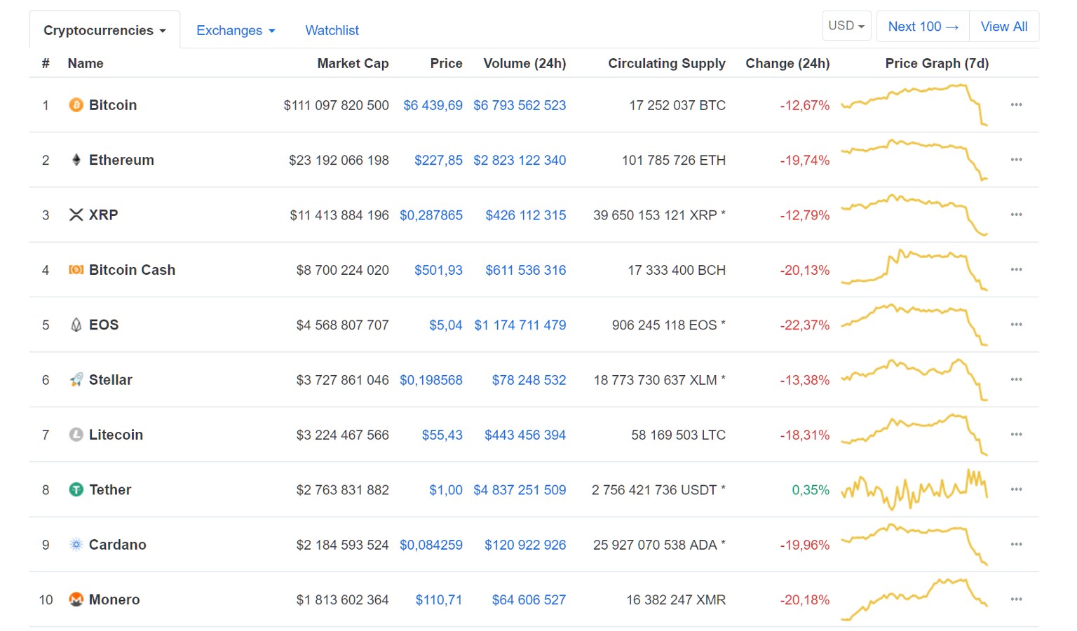 Начавшееся в среду резкое падение криптовалютного рынка продолжилось в ночь на четверг, 6 сентября, когда биткоин, подешевев в совокупности более чем на 12%, опустился в цене ниже отметки $6500. Средневзвешенный курс первой криптовалюты составлял $6439.17, при этом на ряде бирж в результате резкого снижения цена биткоина падала до отметок около $6250. Рыночная капитализация биткоина составила $111,09 млрд.