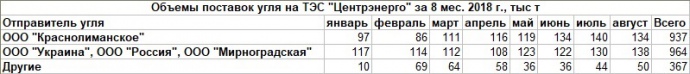 В соответствии с ними, основными отправителями угля в адрес «Центрэнерго» являются ООО «Краснолиманское» (за 8 мес 2018 года было поставлено 0,94 млн тонн), а также тройка углеобогатительных фабрик — «Украина», «Россия» и «Мирноградская» (ранее — «Комсомольская»).
