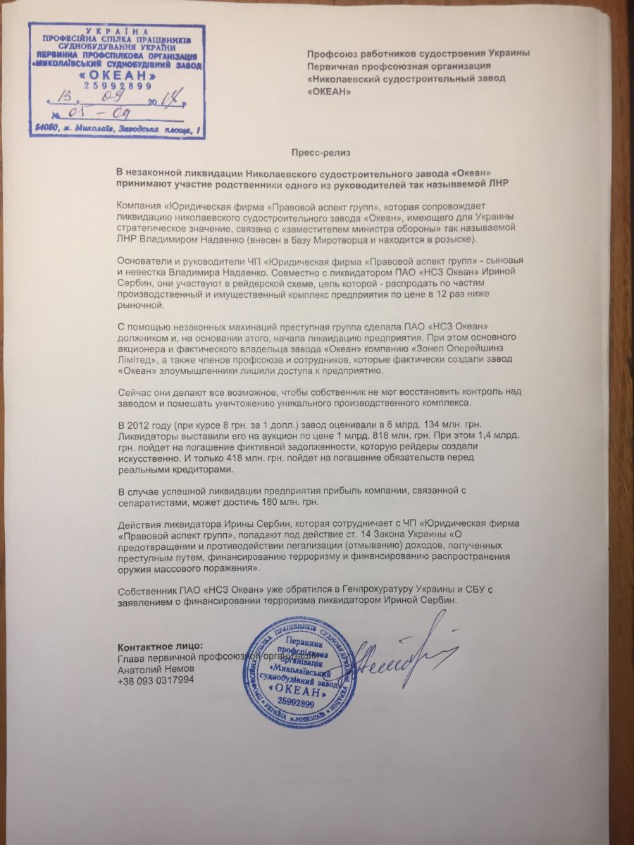 Собственник ЧАО «НСЗ Океан» уже обратился в Генпрокуратуру Украины и СБУ с заявлением о финансировании терроризма ликвидатором Ириной Сербин, подчеркивается в заявлении.
