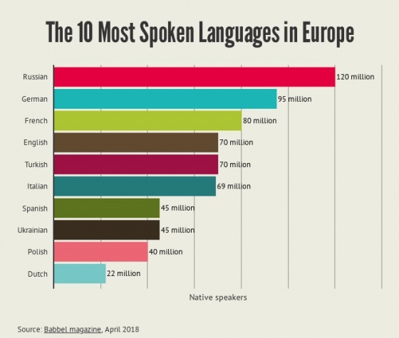 После тройки лидеров в списке расположились английский, турецкий и итальянский. Следующие строчки заняли испанский, украинский и польский.