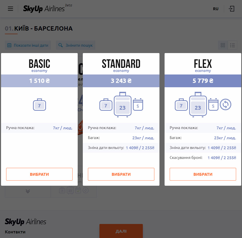 SkyUp предлагает билеты эконом класса по трем тарифам.