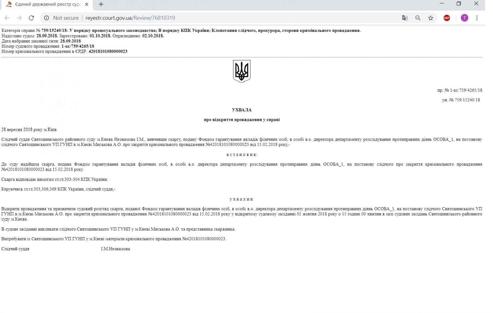 Как сообщается в постановлении Святошинского районного суда Киева, ФГВФЛ обжаловал закрытие соответствующего криминального производства следователем Святошинского УП ГУНП. Жалоба Фонда принята судом к рассмотрению.