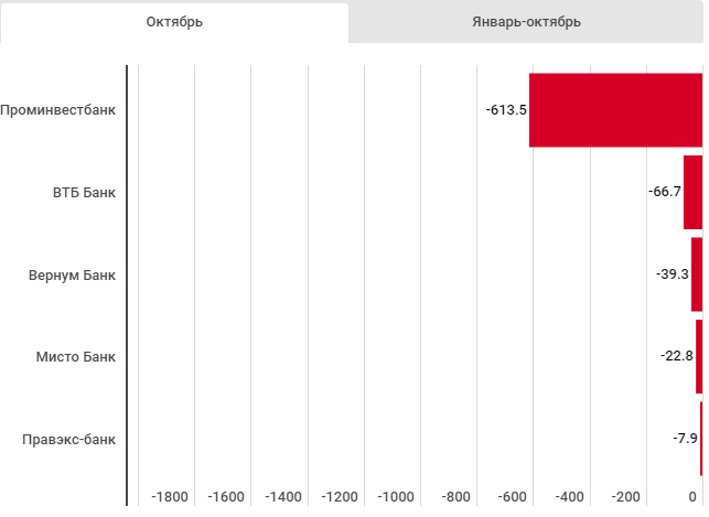 Самыми убыточными были банки с российским капиталом: Проминвестбанк потерял 613,5 млн гривен, а ВТБ Банк — 66,7 млн гривен. В ноябре в ВТБ Банк вошла временная администрация после признания банка неплатежеспособным.