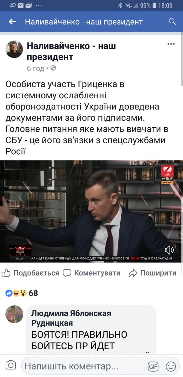 «В тех документах, которые я видел у антикоррупционеров, есть подписи Гриценко. А это свидетельствует, что он лично утверждал контракты, по которым расхищалась украинская армия, земли, имущество и оружие», — подчеркнул Валентин Наливайченко.
